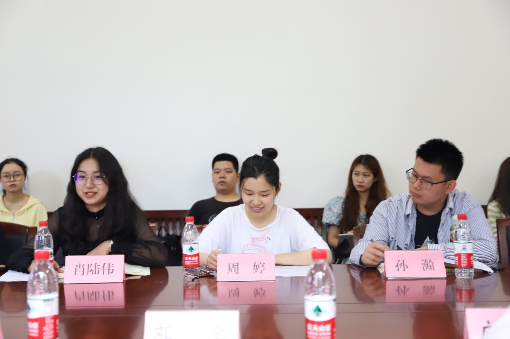 团学工作经验交流分享会在文法楼230会议室举行。文新院党委书记罗军飞、党委副书记邓栗,资安院辅导员周婷、孙瀚,分团委书记肖陆伟,文新院学工办主任唐苗,分团委书记易孝慈,以及两院团学骨干成员出席本次会议。