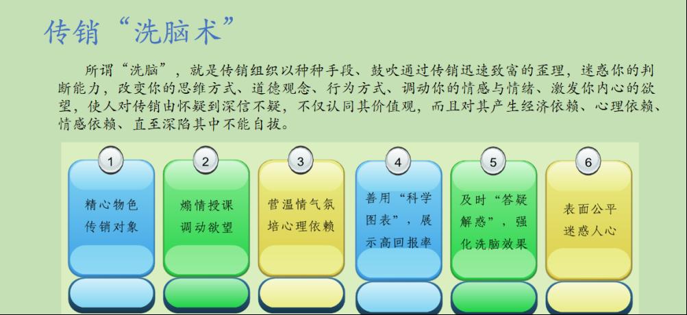 周婷老师介绍到,传销的本质是靠拉人头骗钱,目的是把你的钱骗到手,再将你培养成为他骗钱的工具。传销会将骗术包装成有光环的洗脑术,通过给“馅饼”,让你掉入“陷阱”。传销流程往往有四个步骤:电话邀约、实施软禁、洗脑控制、缴纳费用。其中,洗脑控制环节尤为重要,对方会以种种手段鼓吹传销迅速致富的歪理,通过煽情授课调动欲望,使人对传销由怀疑到深信不疑,彻底改变人的思维方式和价值观,从而甘心沦为传销团伙的帮凶。传销的洗脑手段不胜枚举,许多受过高等教育的大学生也不免中招。实际上,在传销鼓吹的“一夜暴富”梦后,是一张张触目惊心的照片,一个个支离破碎的家庭。