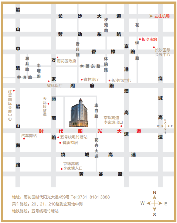 长沙时代华瑞大酒店邻近长沙南站、黄花国际机场、省植物森林公园、国际会展中心、咫尺京港澳高速、绕城高速,交通便利,环境优雅。