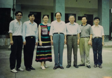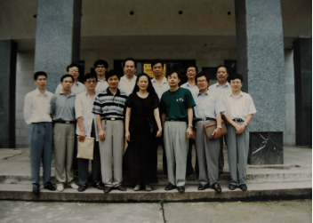 图4 1996年,教研室老师与来访的美国弗吉尼亚大学矿山通风专家Y J WANG教授在采矿楼前合影