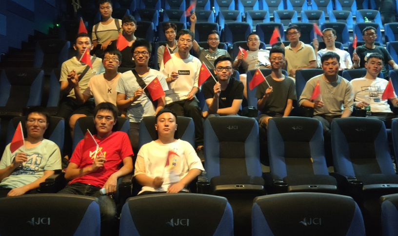 70华诞,国旗招展。9月30日下午5时,为纪念新中国成立70周年,持续推进“不忘初心、牢记使命”主题教育,大力弘扬爱国主义精神,厚植红色基因,硕士2018级一支部组织全体党员和部分积极分子前往影院观看影片《我和我的祖国》。观影现场支部书记郭懿德同志向大家发放了国旗和脸贴。