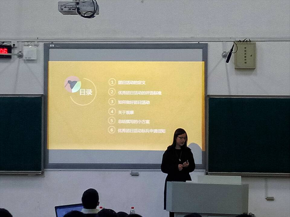 主持人宣布培训会开始,左天元同学首先上台发言,从团日活动的组织开展,宣传号召,活动策划,流程环节的优化四个方面开始介绍,过程中分享了几篇优秀的团日活动总结,并介绍了其中亮点和入选十佳的原因。最后谈到策划的书写和良好的心态是成功的团日活动的必要条件,并特别强调了团日活动过程中总结大会的重要性,和申请观摩的申报条件等,同学们感受颇深。