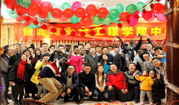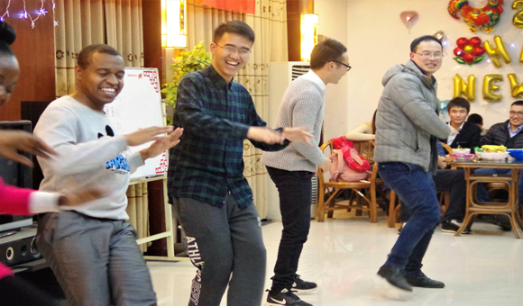 研究生王明虎的吉他弹唱《姑娘》强烈的舞台表现力让大家不由自主地随着歌曲摇摆。本科生田泽同同学的歌曲串烧更将现场气氛推上小高潮。随后,热情的留学生极具异域风情的舞蹈吸引了现场观众与老师共舞。此次晚会不仅节目精彩纷呈,中途还穿插了抽奖与“合力吹气球”、“我是食神”、“你画我猜”等互动游戏环节,活动现场高潮迭起,观众笑声、掌声、喝彩声不断,每个人都沉浸在新年和乐融融的氛围中。最后,所有中外学子与在场领导老师合影留念,为告别2016、走向2017定格下最美的一幕。