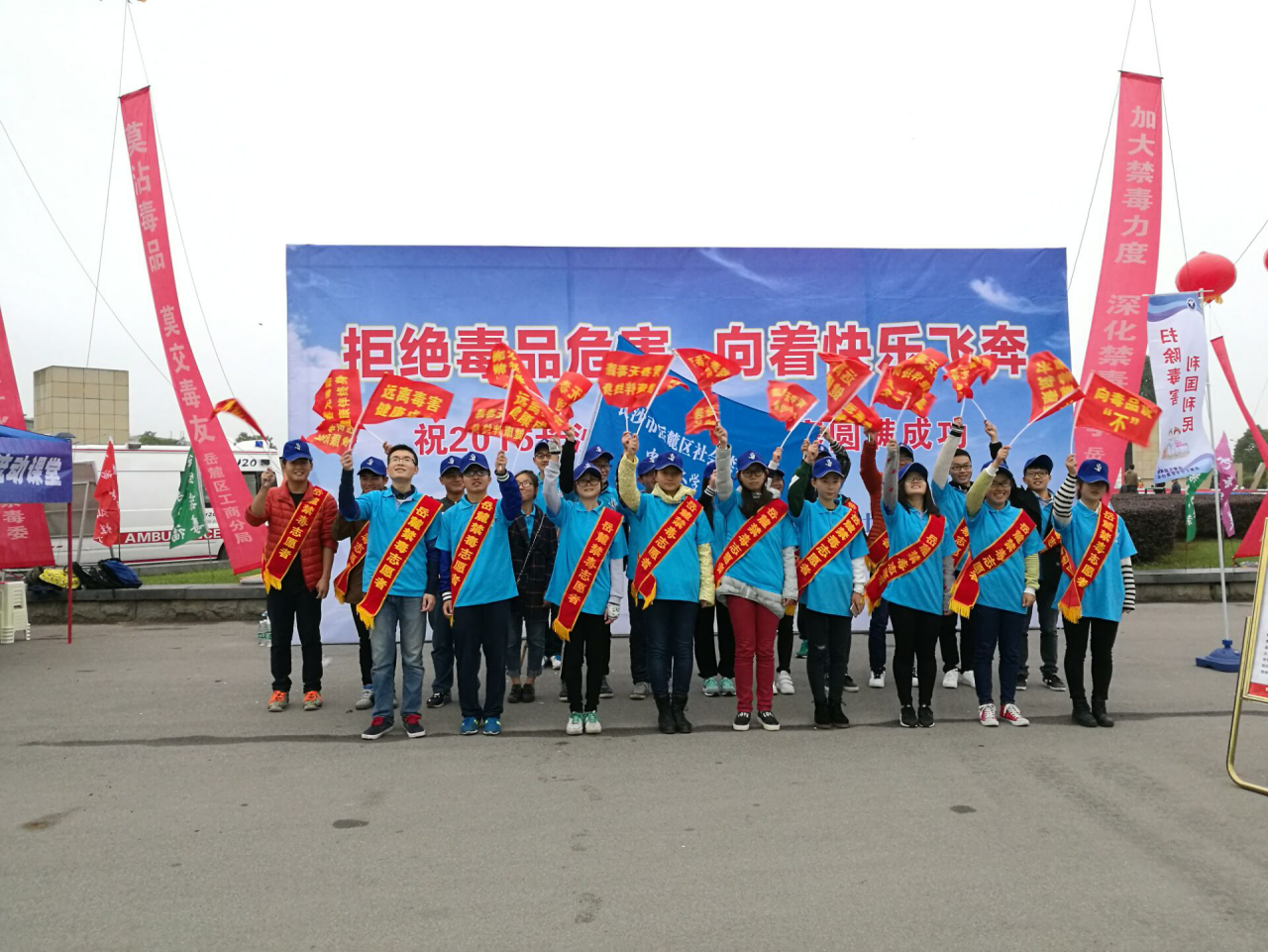 上午7点钟,来自三院的30名志愿者于活动现场集合完毕。随后岳麓区禁毒协会的负责人将任务下发到了各志愿者团队中,志愿者们将活动现场布置完毕后开始了紧锣密鼓的宣传工作。首先,志愿者们向等待马拉松比赛选手到达半程终点的观众发放了禁毒宣传手册和印有相关法律法规的手册,普及毒品常识,宣传禁毒工作。其次,志愿者进场参观的观众就展板内容进行了讲解,得到了观众的一致好评。在活动最后,志愿者们依次在印有“远离毒品危害,倡导健康生活”的条幅上签字,表示参加此次活动的志愿者将以身作则,在今后的生活里心向阳光,拒绝毒品,并以积极的态度感染身边的每一个人。