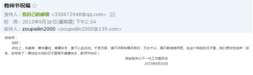 很多名同学一直保持着长期的联系,经常通过电子邮件、书信等多种方式为同学们答疑解难,帮助学生解决生活、学习、心理等各个方面的困惑。邹老师还主动要求每学期到黄色直播