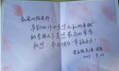 关工委联合院团委共同开展了“访谈·祝愿·求教”活动,为老师们送去节日祝福,聆听老师们的教诲。9月10日的课堂上,有课的同学都早早地来到教室,摆放好为敬爱的老师精心准备的果篮、鲜花和祝福卡片等,授课教师一走进教室,同学就不约而同地用热烈的掌声、齐声的祝福向老师们表达感念师恩的拳拳之心、深深之情。言传身教为人师表,甘为人梯终身不悔。
