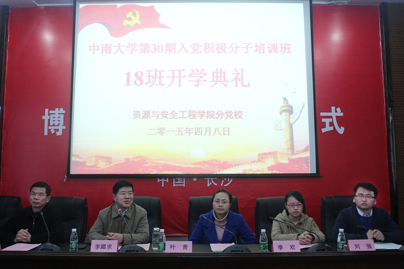 分党校第30期入党积极分子培训班18班开学典礼在采矿楼302报告厅举行。院党委李顺求书记、院党委孙胜副书记、院业务办主任叶青老师、院学工办副主任李欢老师、13级辅导员兼培训班班导师刘强老师出席典礼,院党委孙胜副书记主持本次开学典礼。