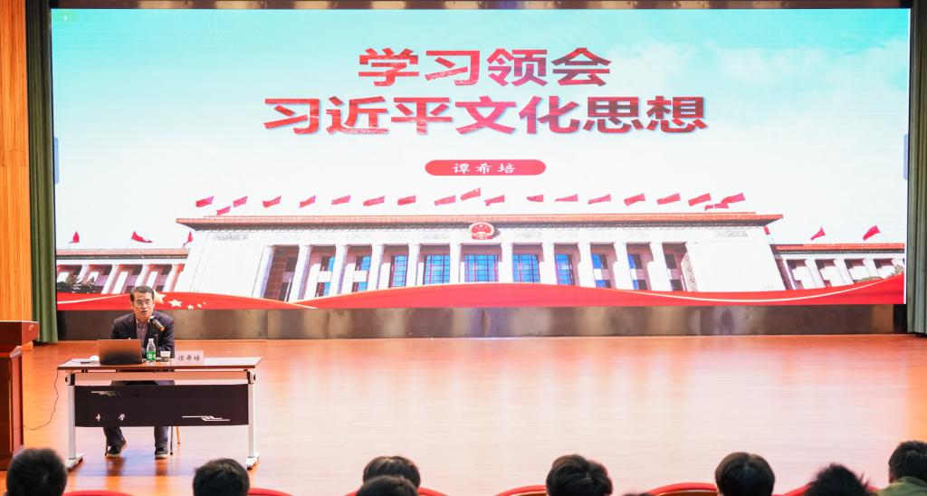 谭希培教授以“学习领会习近平文化思想”为题,分别从习近平文化思想的重要意义、基本内涵与文化建设新高度三个面展开讲解,呼吁党员切实担负起新的文化使命,以习近平文化思想为指导,用理论指导实践,将实践反作用于理论的创新,不断攀登中国特色社会主义文化的新高度。