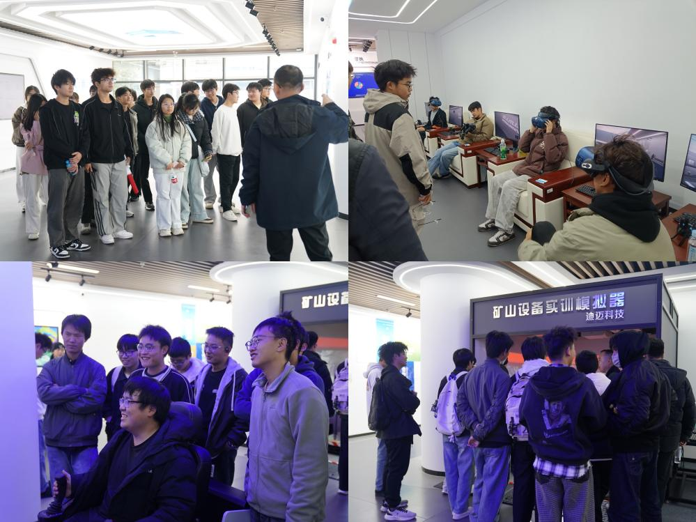 讲座结束后,同学们在讲解员的引导下进入展厅进行自由交流与参观。在公司展示区、虚拟实训平台、VR体验区等多个展台前,学生们近距离观摩和体验了采矿领域的前沿技术及其实际应用场景。活动尾声,全体师生于迪迈公司门前合影留念,为本次实践学习画上圆满句号。